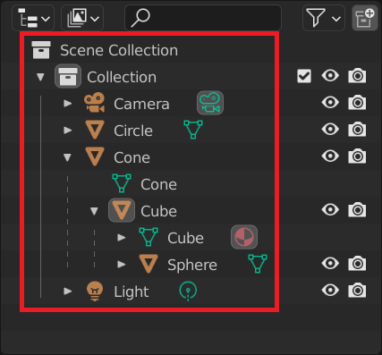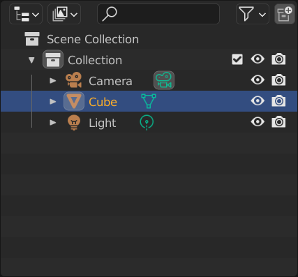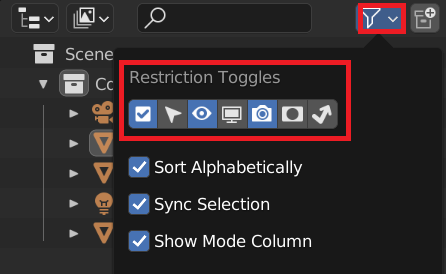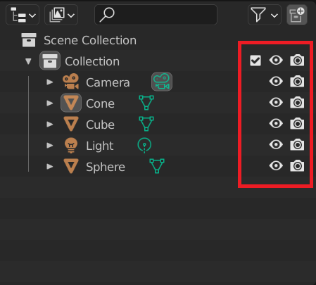 Outliner의 오른쪽을 보면 체크 표시, 눈 모양, 카메라 모양 버튼을 확인할 수 있습니다.